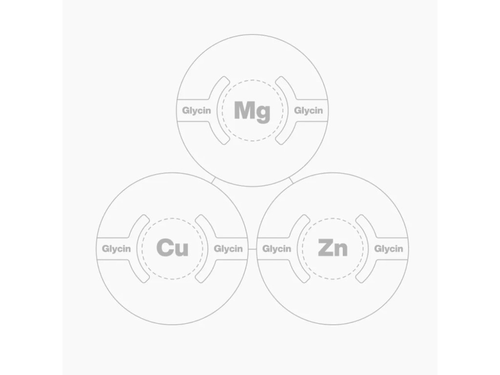 Bisglycinát horečnatý, bisglycinát zinočnatý, stearan horečnatý (protihrudkujúca látka), mikrokryštalická celulóza (plnidlo), bisglycinát meďnatý, vitamín B6 (pyridoxín hydrochlorid), celulózové kapsule.