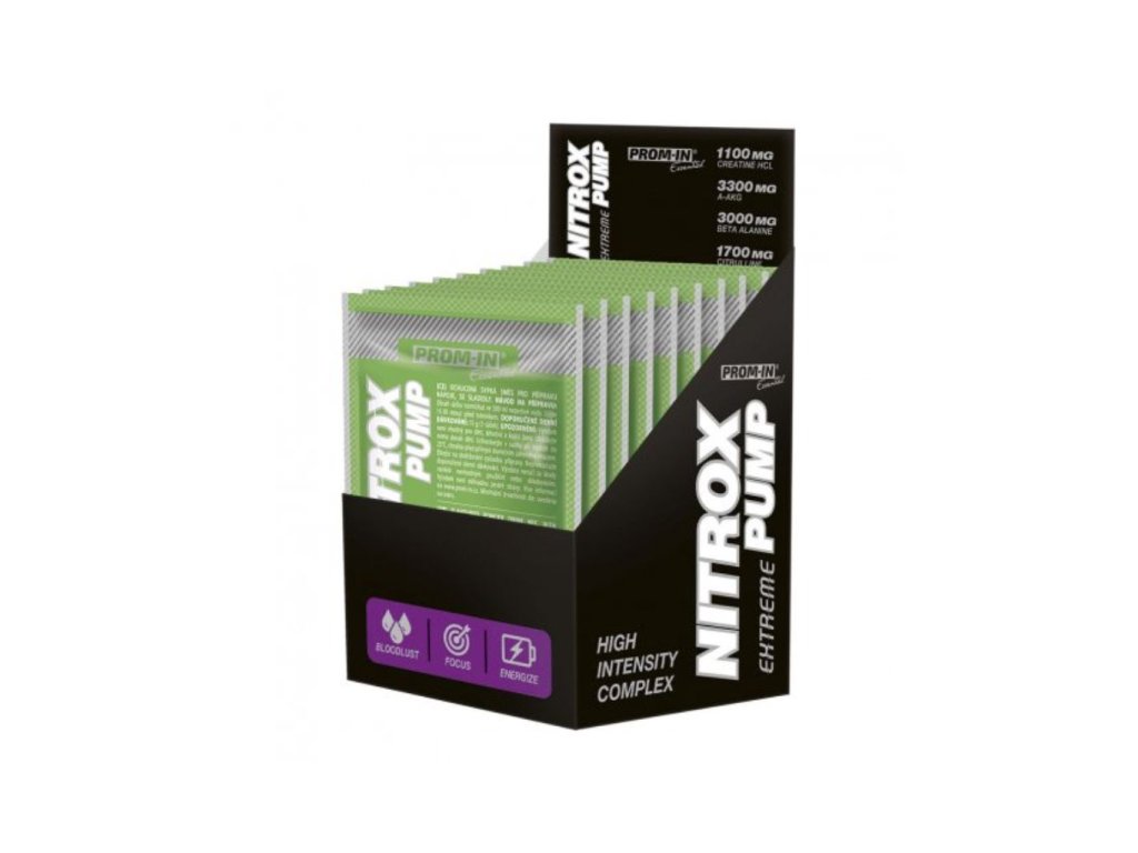 Prom-IN Nitrox Pump Extreme je jedinečný predtréningový booster určený na zvýšenie výkonu a intenzity počas tréningu. Vďaka silnej kombinácii zložiek, ako sú Beta Alanín, kreatín monohydrát, A-AKG a citrulín malát, poskytuje Nitrox Pump všetko, čo potrebujete na dosiahnutie špičkového výkonu a oddialenie únavy. Vysoký obsah kofeínu spolu s extraktom zo zeleného čaju a taurínom zlepšuje koncentráciu, čím podporuje efektívne využitie energie pri cvičení.