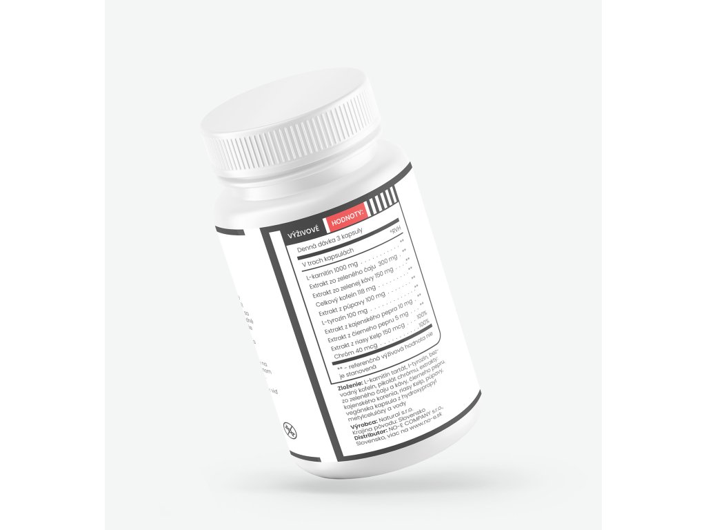 Zloženie: L-karnitín tartrát, extrakt zo zeleného čaju, extrakt zo zelenej kávy, extrakt z púpavy, bezvodný kofeín, l-tyrozín, extrakt z riasy Kelp, extrakt z kajenského korenia, extrakt z čierneho pepru, pikolinát chrómu, vegánska kapsula vyrobená z hydroxypropyl metylcelulózy a vody.