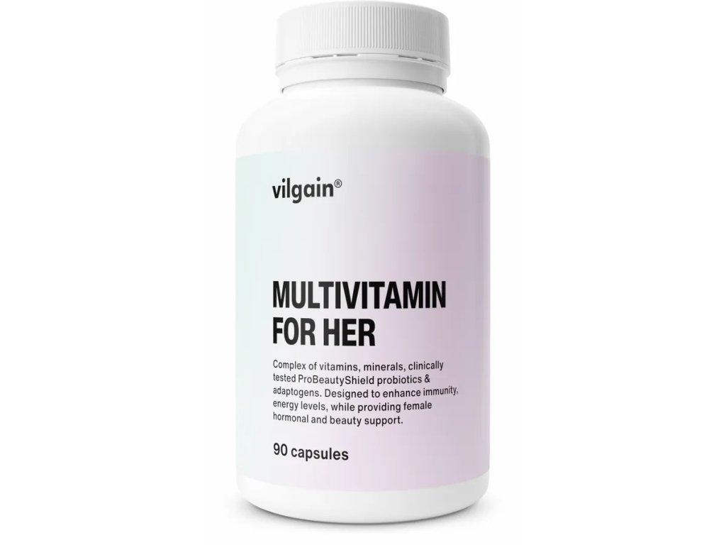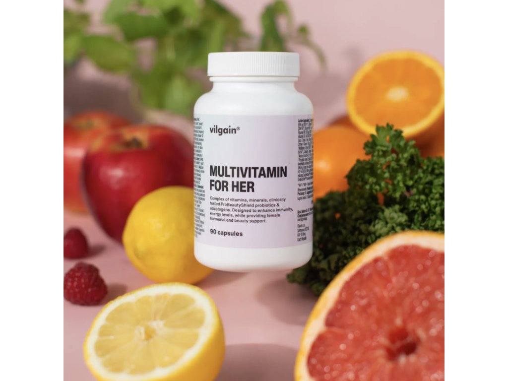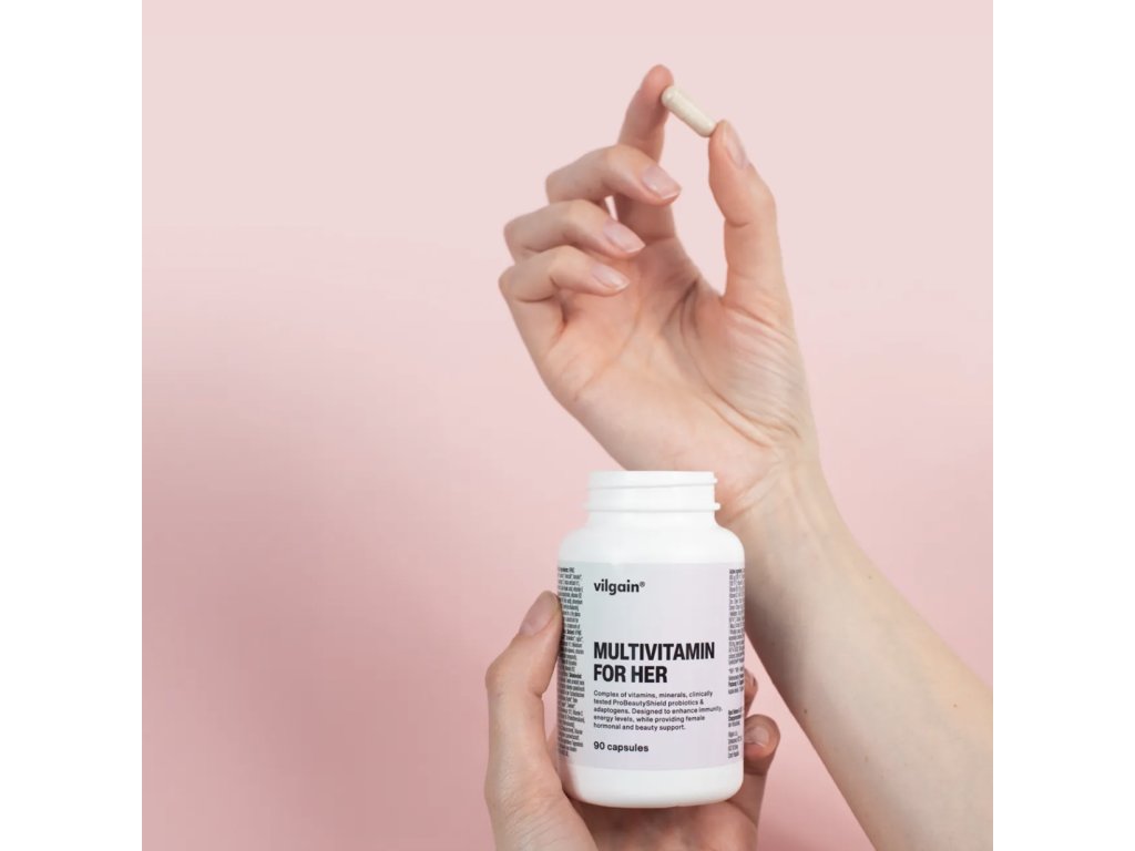Multivitamín For Her je moderný výživový doplnok prispôsobený špeciálnym potrebám žien. Kombinuje 13 esenciálnych vitamínov, 8 minerálnych látok, probiotiká ProBeautyShield, Vitaveggie zeleninový blend a adaptogény. Tento komplex poskytuje telu maximálnu podporu imunity, vitality, hormonálnej rovnováhy aj reprodukčných funkcií.